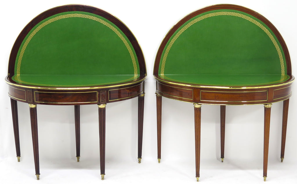 A Beatiful "Near" Pair of Louis XVI Style Mahogany and Brass Mounted Demilune Games Tables
